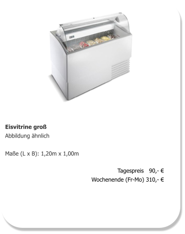 Eisvitrine groß Abbildung ähnlich  Maße (L x B): 1,20m x 1,00m   Tagespreis   90,- € Wochenende (Fr-Mo) 310,- € Buchen Buchen Eisvitrine klein Abbildung ähnlich  Maße (L x B): 1,20m x 0,90m     Tagespreis   80,- € Wochenende (Fr-Mo) 299,- € Buchen Buchen